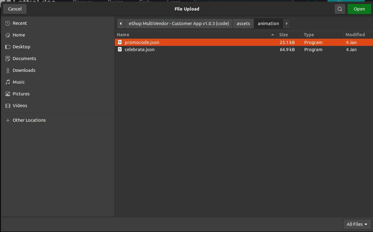 - Select assets/animation/promocode.json file and open