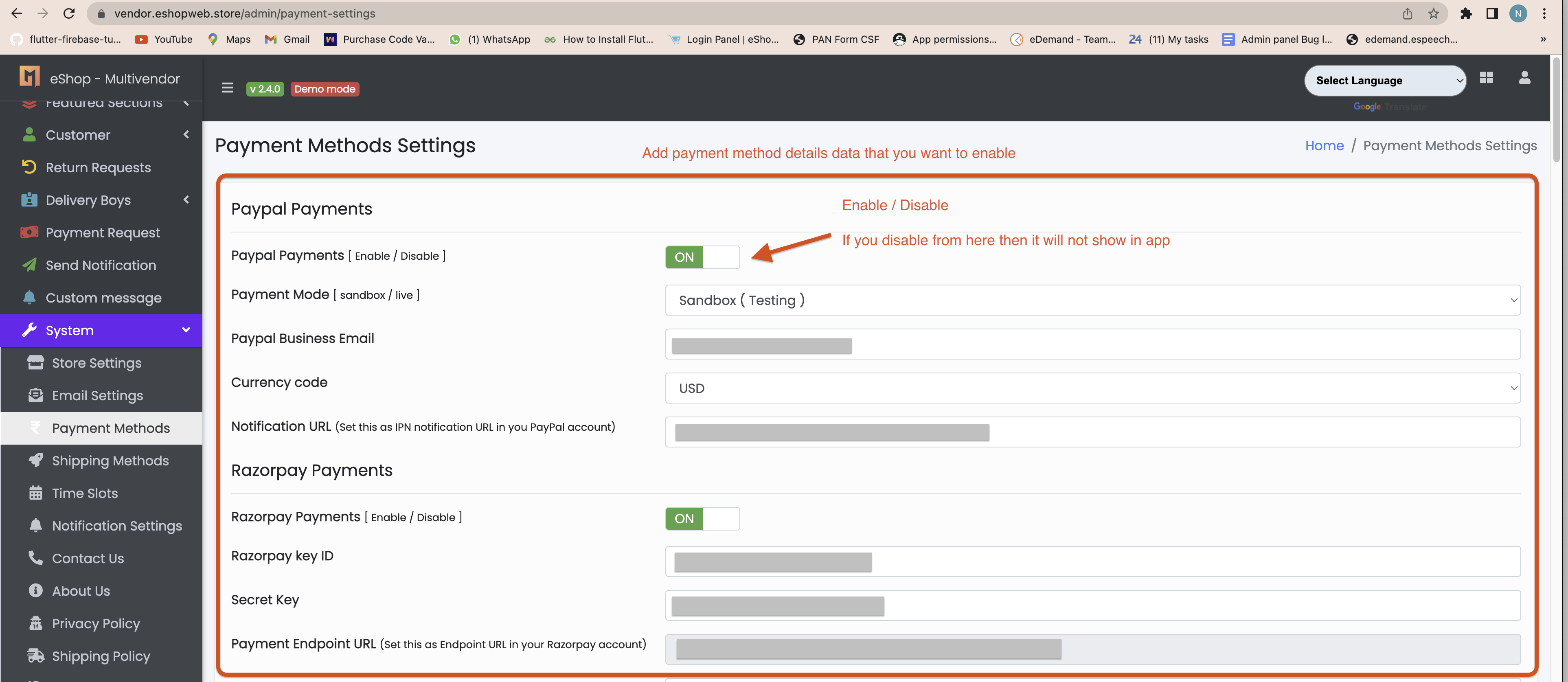 - go to the panel, in that system > payment mehod. for any payment method you have to add just key id and secrect key.and if you don't wanat to use then disable from here.